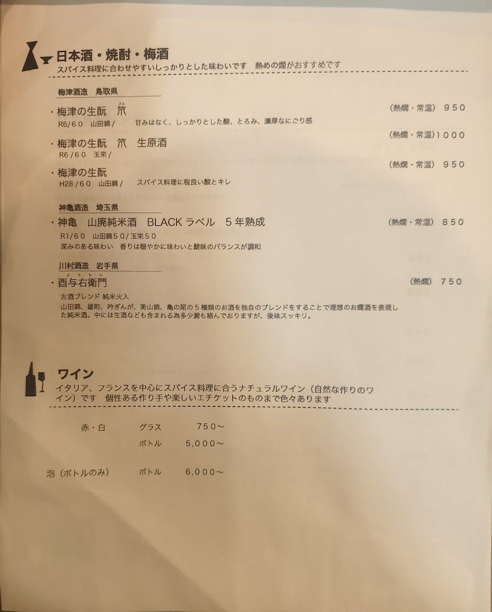 For those who enjoy lighter options or a more casual meal, the ポークバルチャオとバスマティライス (Pork Balchao with Basmati Rice) offers a flavorful pork dish that pairs perfectly with fragrant basmati rice. The 南インド風チキンカレー (South Indian Style Chicken Curry) is another great option for curry lovers, delivering the bold and spicy flavors typical of South Indian cuisine. To complement the rich flavors of the meal, guests can enjoy a refreshing drink, such as Red Wine or クラフトビール (Craft Beer), which enhances the dining experience with their unique and well-crafted flavors.