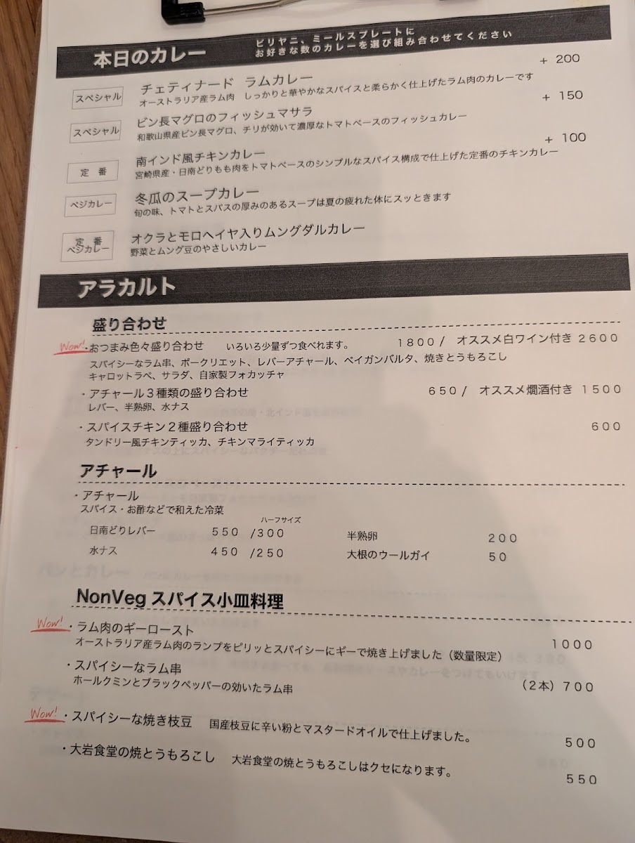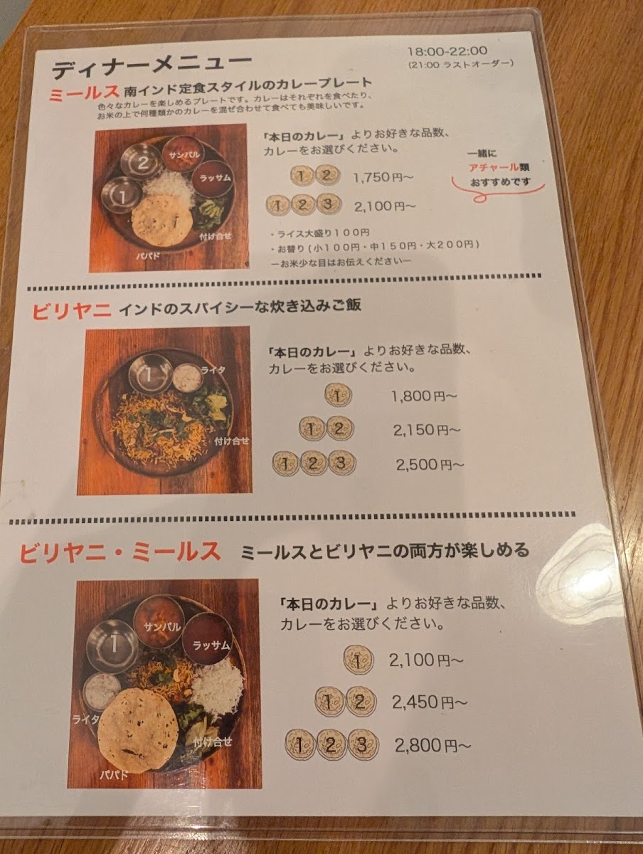 For a quick snack or on-the-go meal, the カレーパン (Curry Bun) and チキンビリヤニ弁当 (Chicken Biryani Bento) are perfect choices, offering portable yet satisfying meals. The 食後のチャイ (Post-Meal Chai) adds a comforting touch to the meal, making it a great way to unwind after enjoying the savory dishes. Lastly, the inclusion of 辛いピクルス (Spicy Pickles) on the menu provides a zesty and tangy kick that complements the rich and flavorful main courses.